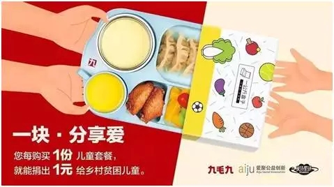 2017年新年伊始 历时9个月,九毛九联合一公斤盒子及食货星球共同发起了“一块·分享爱”的公益活动。每卖出一份九毛九儿童套餐,九毛九捐出一块钱用来购买一公斤盒子创新教学工具包。所购置的一公斤盒子都将被捐赠到指定的乡村小学